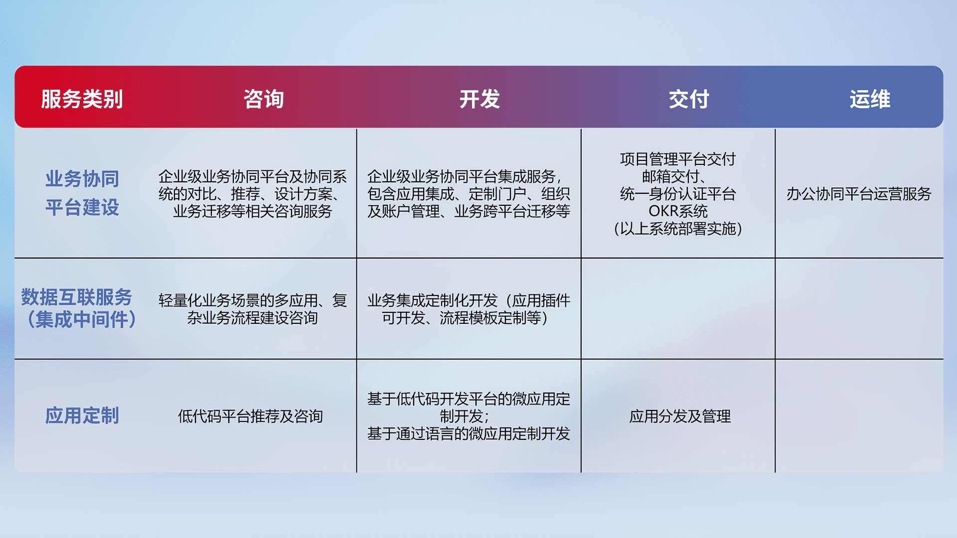 针对钉钉、、、企微、、、IDaas等平台级产品提供产品的规划、、、、方案、、交付、、、定制化开发等服务,,,,实现如统一协同办公、、、智能客户服务、、、混合会议管理、、、、智能数据查询、、、等业务场景,,实现数字化转型。。。。