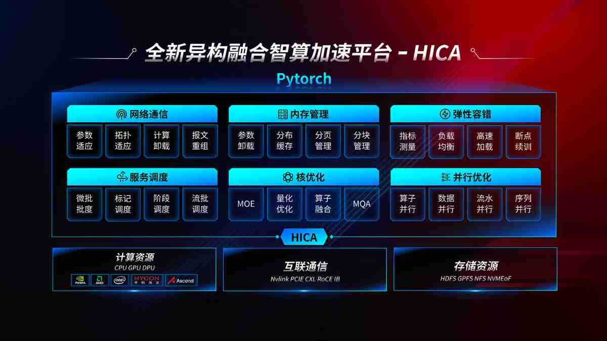 通过自研的服务层、、中间适配层、、以及调度编排算法,,,,采用数据并行、、、、模型并行等多种并行方式,,把并行计算任务进行有效的分解,,使其分别由相应的软件栈和算力资源来承接。。。当GPU资源变化,,HICA可以实时动态调度计算子任务并调整模型拓扑和架构,,,以充分聚合各种算力资源。。。