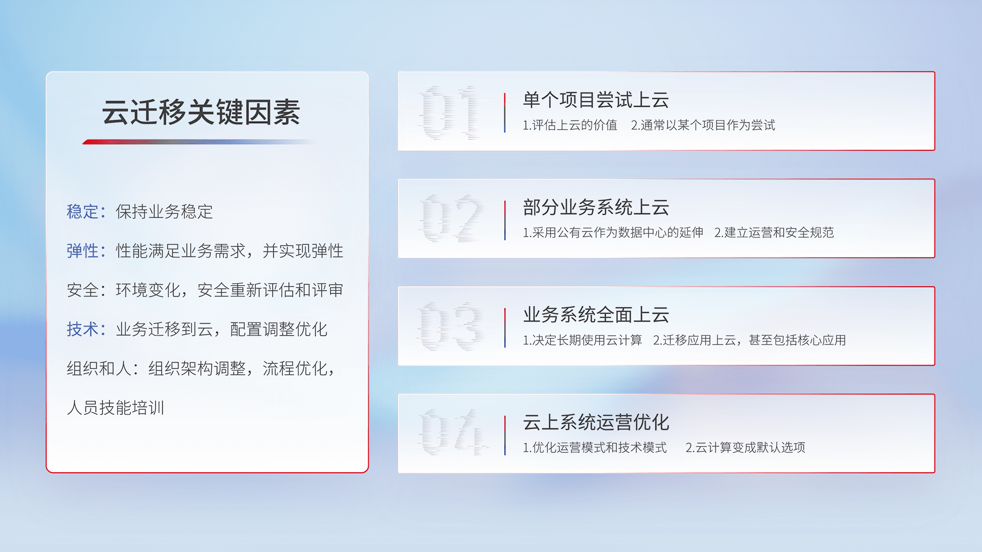 结合实际业务,,,从规划设计、、、、云平台选型、、、云原生改造、、数据迁移、、、集成交付,,,,迁移全过程为客户识别最佳上云路径,,做好风险识别管理,,设计网络架构、、身份权限、、、、安全审计合规、、、、操作审计、、日志审计、、监控告警策略、、、、多站点容灾设计等,,,对云上基础设施进行整体规划,,提升IT治理水平,,,以满足弹性、、、、高可用、、、高性能的需求。。。